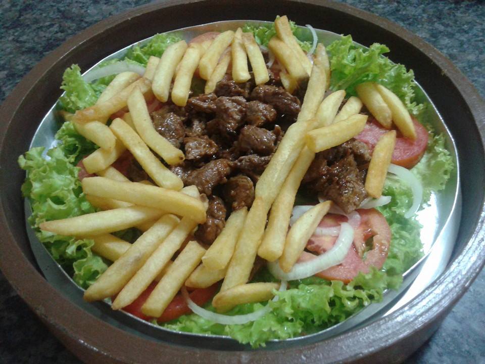 Batata frita, alface,rodelas de cebola, tomate, rodelas depresunto com mussarela