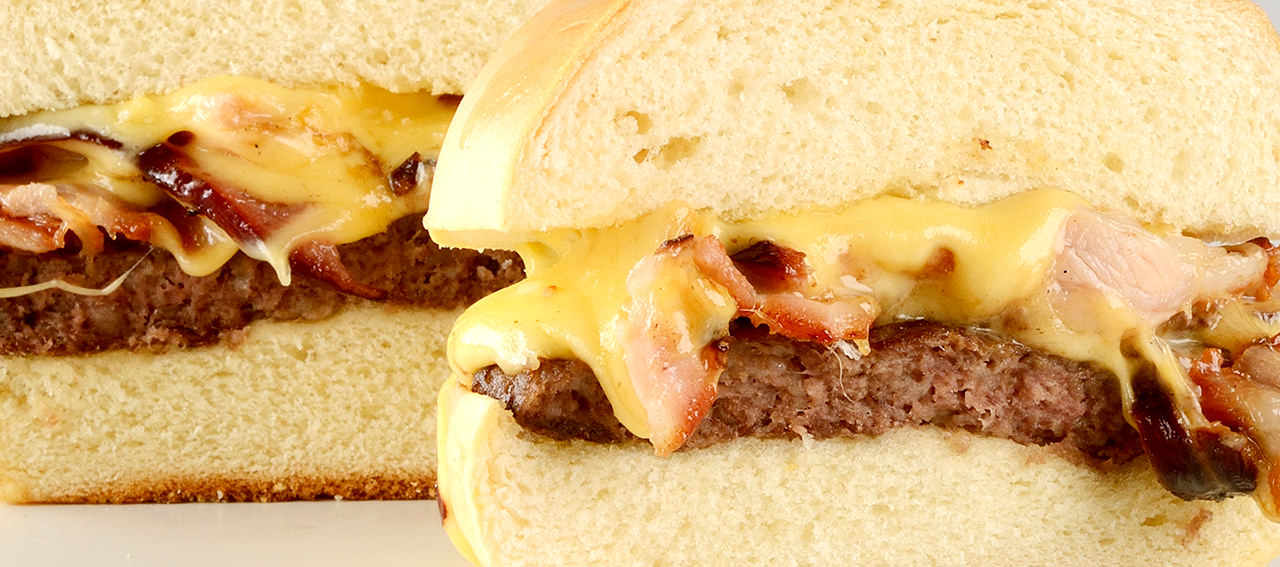 Pão, carne de hamburguer, molho especial, bacon, presunto, mussarela, alface e tomate