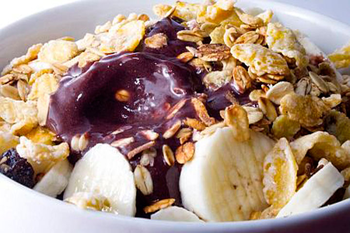 Poupa de açaí, banana, granola, leite condensado, leite em pó e mel